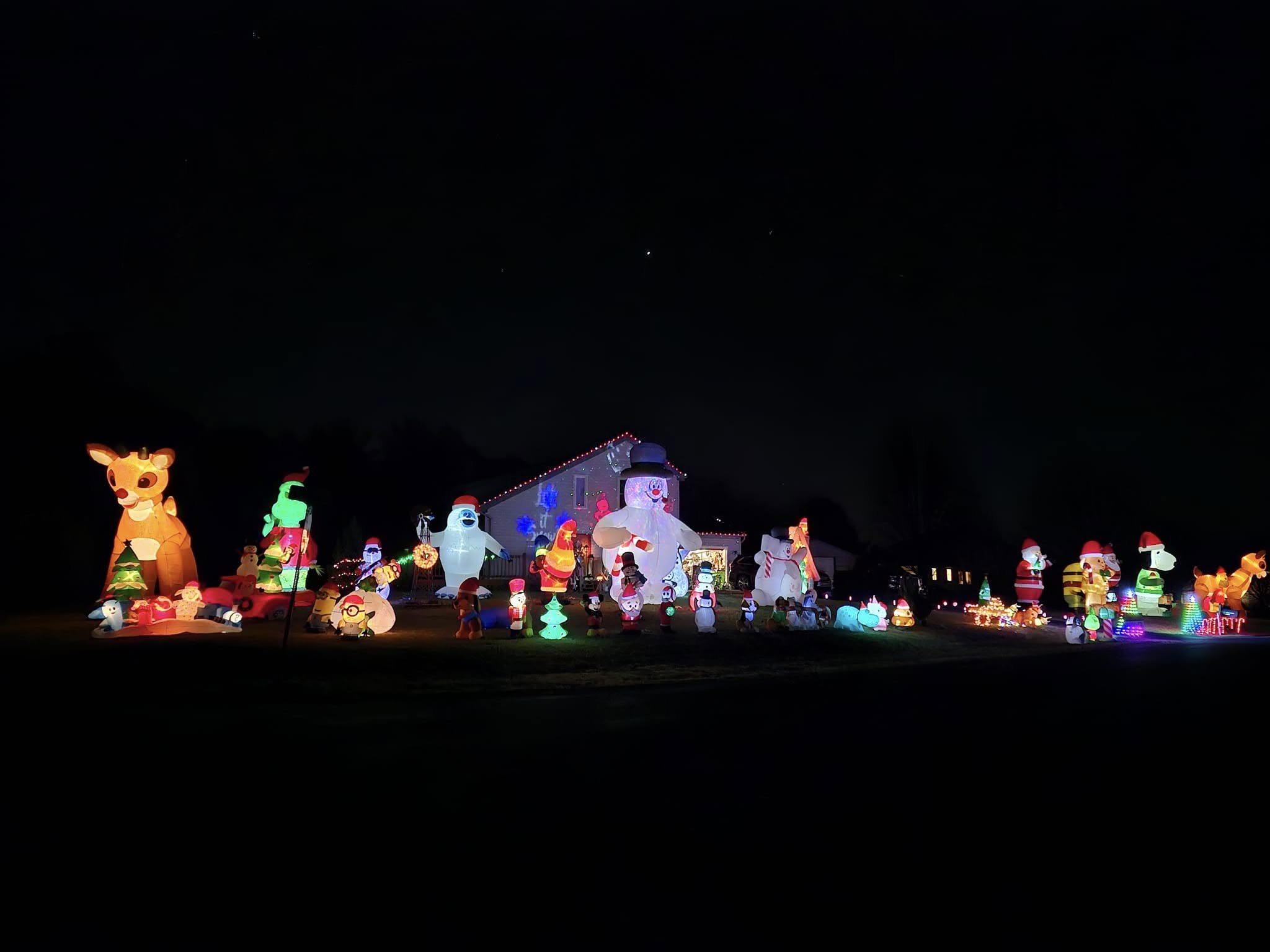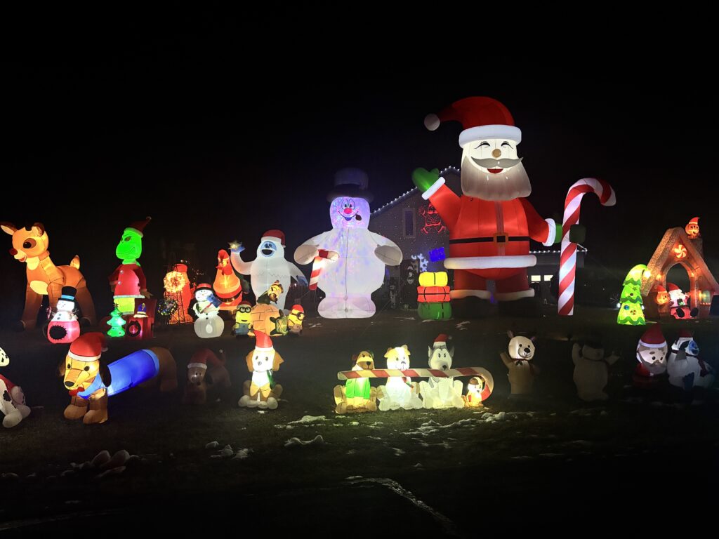 The inflatables are not up in the wind. When the weather allows, they are up nightly from 5:30 to 9:00; closer to Christmas they are on until 10:00. They are up until December 31.
